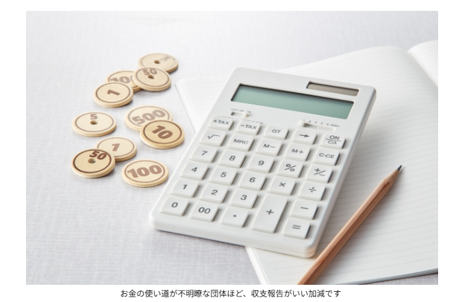 また、収支をアップしていたとしても内訳が杜撰で大雑把な団体も割と目に付くところでして、使途不明金があるのではないか? と疑わしく感じることもしばしば。